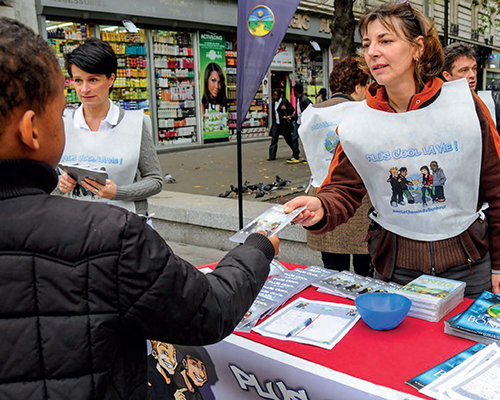 The Way to Happiness team next focused on the center of crime, Saint-Denis City, where they distributed another 50,000 booklets to mailboxes and to more than 1,300 businesses and storekeepers in the area who then made the booklets available to customers. The team also organized clean-up events and Life is Cool! pledge signing to involve the community.