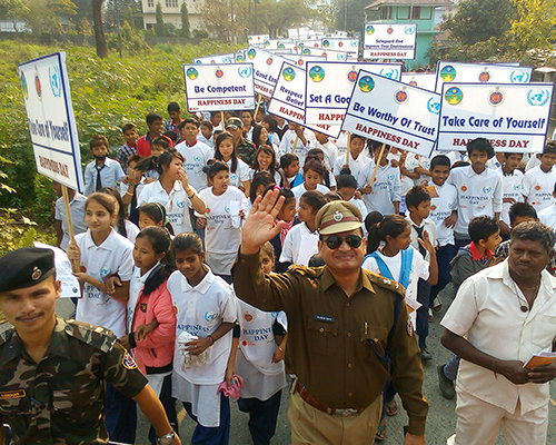 The “Happiness March” was launched by the Member of Parliament for Arunachal State and included government officials, representatives of the Arunachal Police Department, and other civic and social organizations. Adults and children alike carried placards with each precept and wore Happiness Day T-shirts.